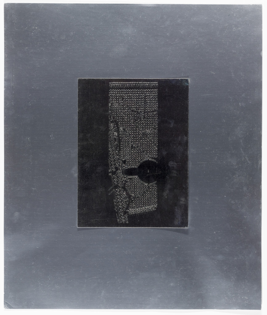 Blind embossing on aluminum-coated paper mounted on aluminum-coated paper, from an illustrated book of texts and three embossings