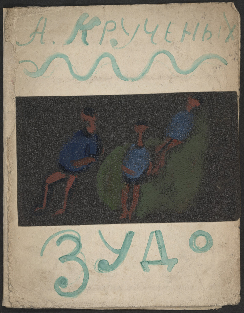 Book with two ink illustrations, one oil paint illustration, rubber-stamped text, and watercolor, ink, and hectographed manuscript text